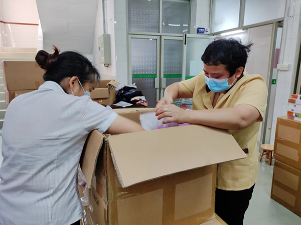 在发放物资过程中,我们得到广州市接收社会捐赠工作站的大力支持。除了给奋勇的捐赠物资外, 还在发货现场帮助奋勇对捐赠物资进行核对数目、分类包装和运输等工作。