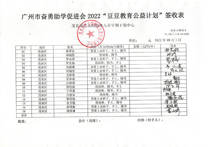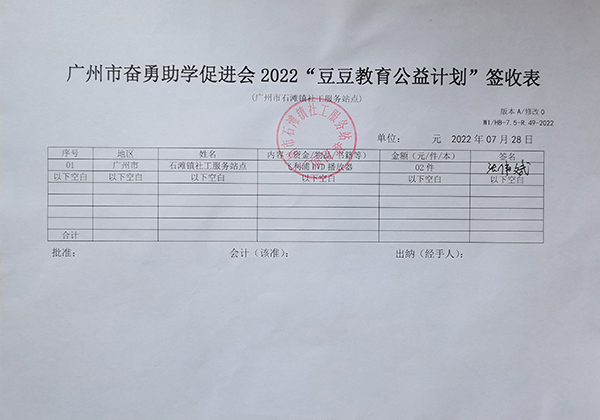 近日,广州市奋勇助学促进会举办“2022豆豆教育公益计划”助学、敬老活动(2022年第5期捐赠物资)工作物资发放到广州市石滩镇社工服务站、茂名市红太阳儿童康复中心。捐赠物资得到广州市接收社会捐赠工作站大力支持。
