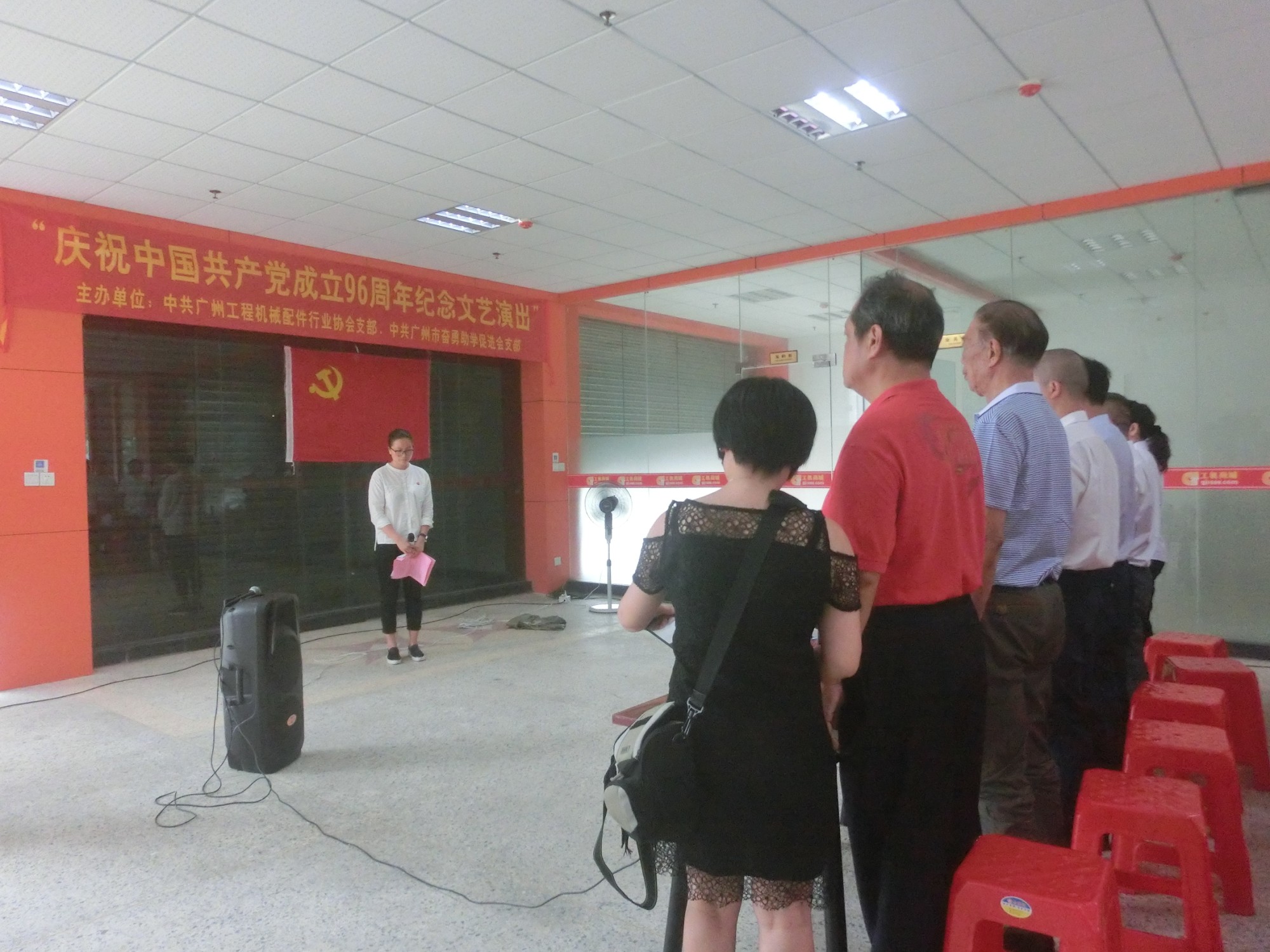 在”七一”建党节到来之际,7月1日上午,由中共广州市奋勇助学促进会支部、中共广州工程机械配件行业协会支部联合开展的“庆祝中国共产党成立96周年纪念文艺演出”的爱党主题活动在广州市花都区国际机械城隆重举行。此活动通过重温入党誓词仪式、歌唱红色歌曲等形式来欢庆“七一”建党节。奏国歌歌唱红歌一 歌唱红歌二 歌唱红歌三